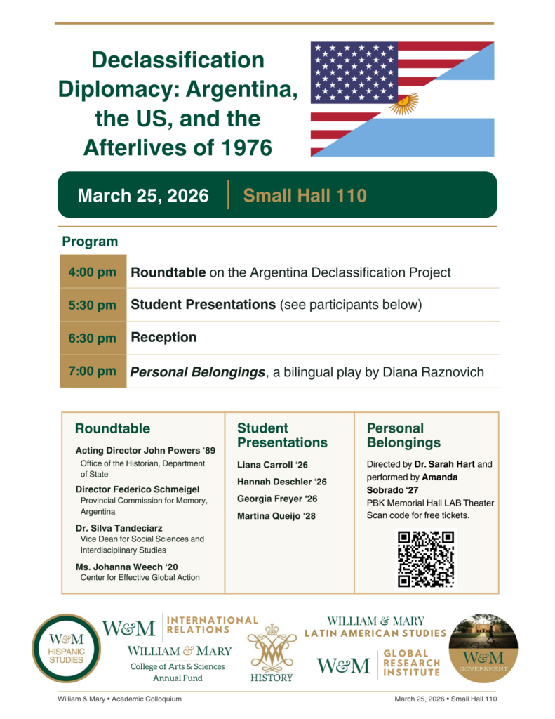 The colloquium will begin with a roundtable at 4:00 highlighting William & Mary’s role in the Argentina Declassification Project, examining the practice and politics of declassification; archives as evidence for truth-seeking and trials; the ethics of secrecy and disclosure; and how primary sources change what we can teach, research, and know about the dictatorship and its afterlives, featuring John Powers ’89, Acting Director of the Office of the Historian; Federico Schmeigel, Director of the Program for the Control of Corruption and Illegal Intelligence at the Provincial Commission for Memory (La Plata, Argentina); Dr. Silvia Tandeciarz, Vice-Dean for Social Sciences & Interdisciplinary Studies and Chancellor Professor of Hispanic Studies, and Johanna Weech ’20, Research Transparency Program Manager at the Center for Effective Global Action (CEGA).