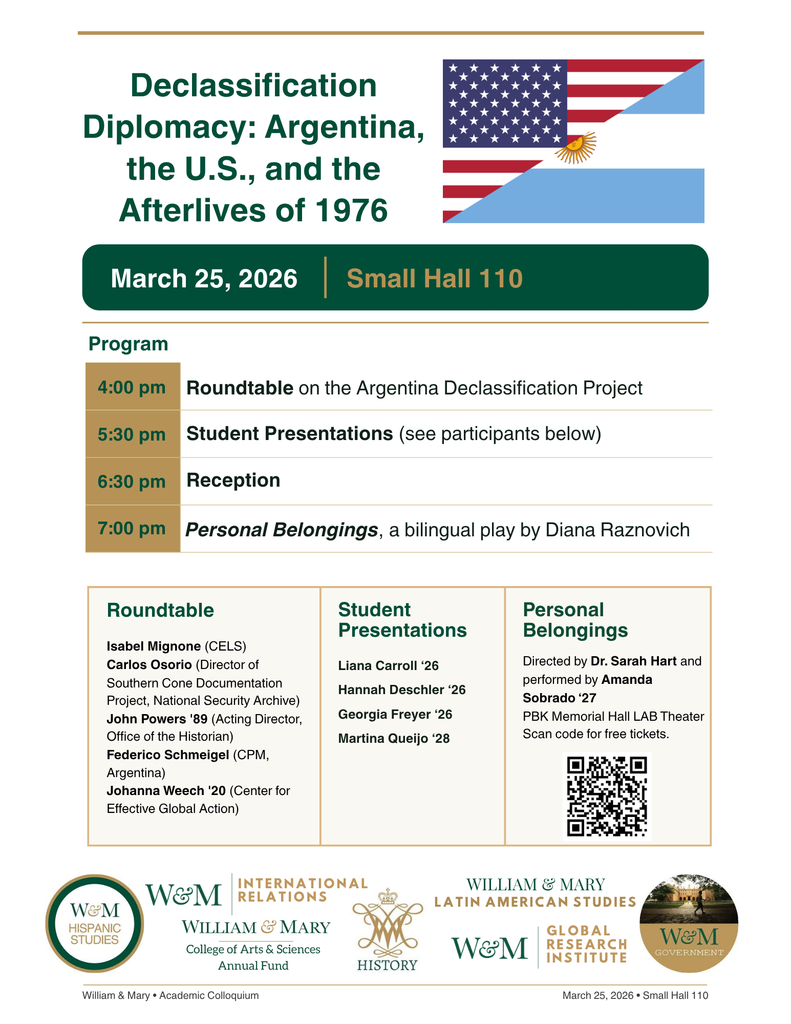 The colloquium will begin with a roundtable at 4:00 highlighting William & Mary’s role in the Argentina Declassification Project, examining the practice and politics of declassification; archives as evidence for truth-seeking and trials; the ethics of secrecy and disclosure; and how primary sources change what we can teach, research, and know about the dictatorship and its afterlives. The roundtable will be moderated by Dr. Silvia Tandeciarz, Vice-Dean for Social Sciences & Interdisciplinary Studies and Chancellor Professor of Hispanic Studies, and feature Isabel Mignone, member of the Center for Legal and Social Studies (CELS), an Argentine Human Rights NGO; Carlos Osorio, Director of the Southern Cone Documentation Project at the National Security Archive; John Powers ’89, Acting Director of the Office of the Historian (Department of State); Federico Schmeigel, Director of the Program for the Control of Corruption and Illegal Intelligence at the Provincial Commission for Memory (La Plata, Argentina); and Johanna Weech ’20, Research Transparency Program Manager at the Center for Effective Global Action (CEGA).